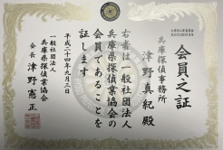 | 代表 津野憲正 内閣総理大臣認可法人 全国調査業協同組合 副理事長 兵庫県探偵業協会 代表理事 姫路探偵事務所 代表 兵庫探偵事務所 顧問 姫路空撮 代表 公益社団法人 兵庫県防犯協会連合会 賛助会員 公益社団法人 日本警察犬協会 正会員 網干防犯協会 賛助会員 |